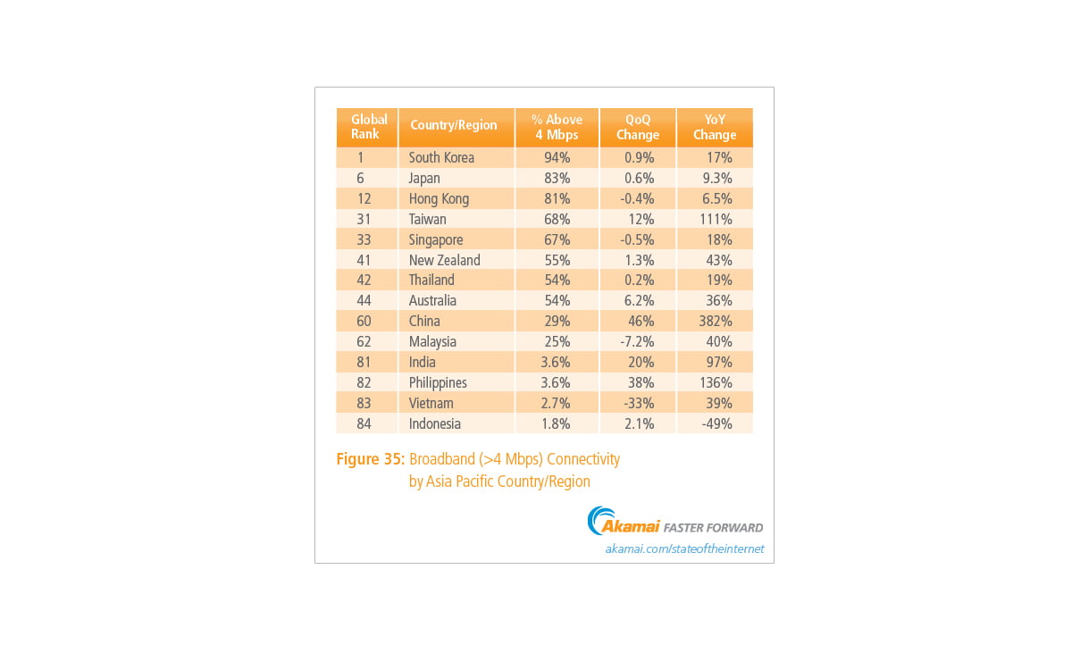 Dünyanın ortalama en hızlı geniş bant internet erişimine sahip ülkesi 21,9 Mbps ile Güney Kore. Güney Kore’yi Japonya, Hollanda, Hong Kong ve İsviçre takip ediyor.