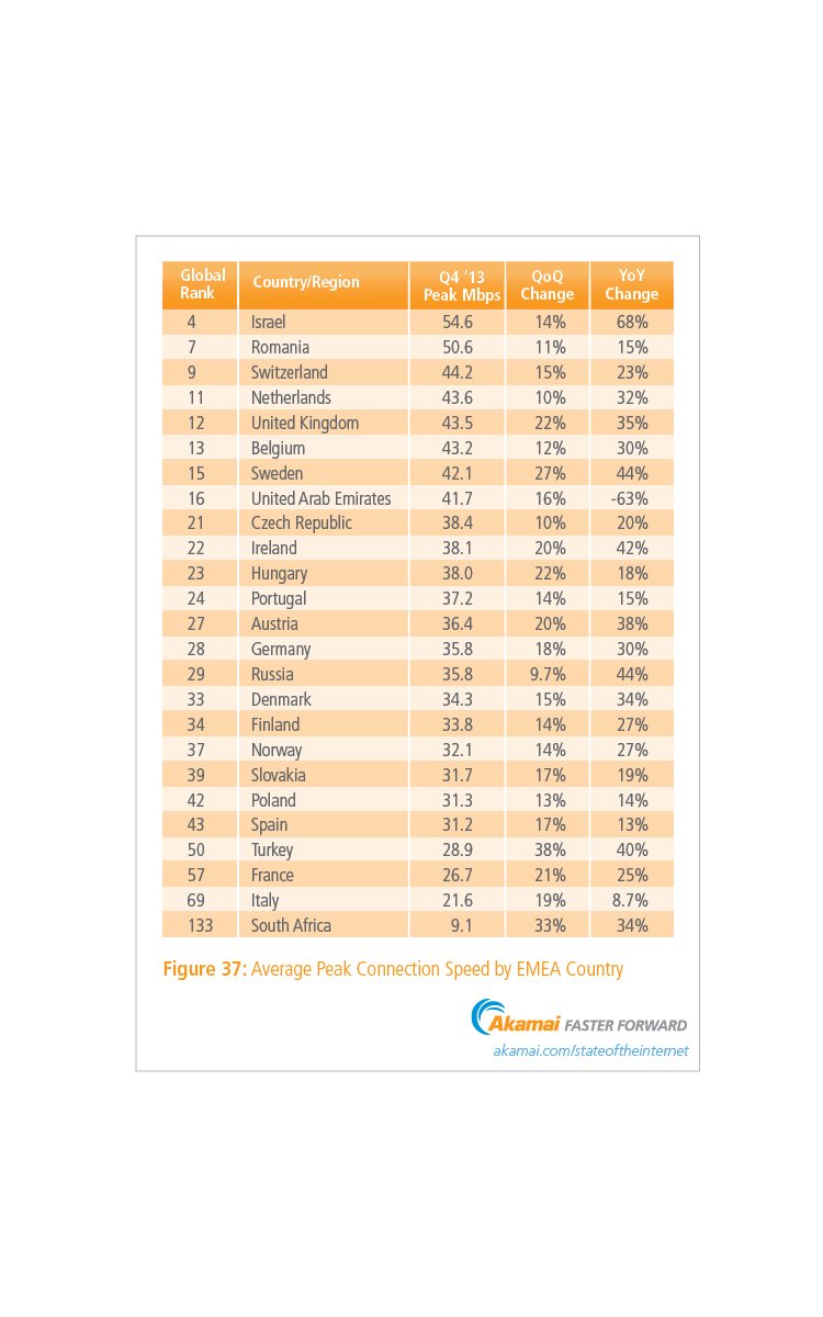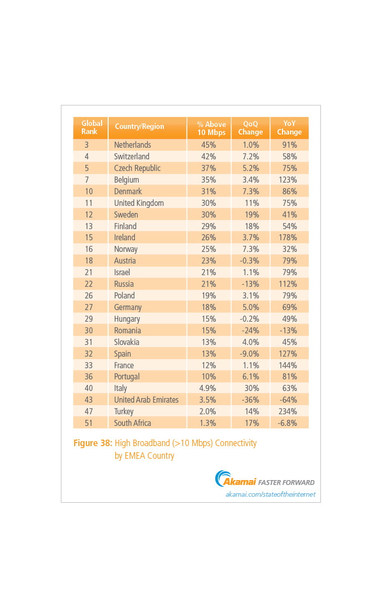 EMEA bölgesindeki ortalama bağlantı hızlarında ise lider ülke 12,4 Mbps ile Hollanda olurken Türkiye 4,3 Mbps ile EMEA bölgesindeki sıralamada 23. ve küresel sıralamada ancak 53. sırada yer alabiliyor.